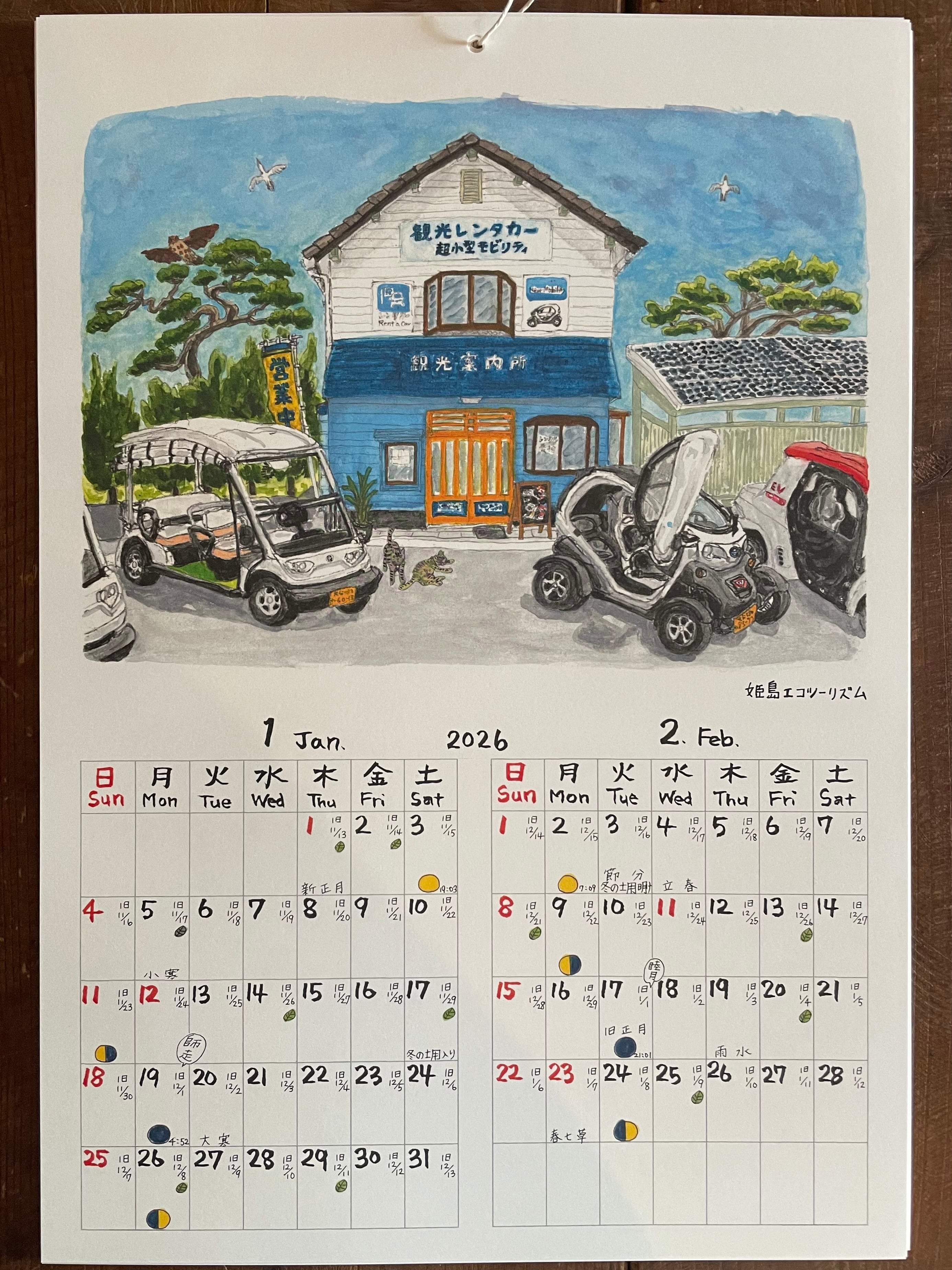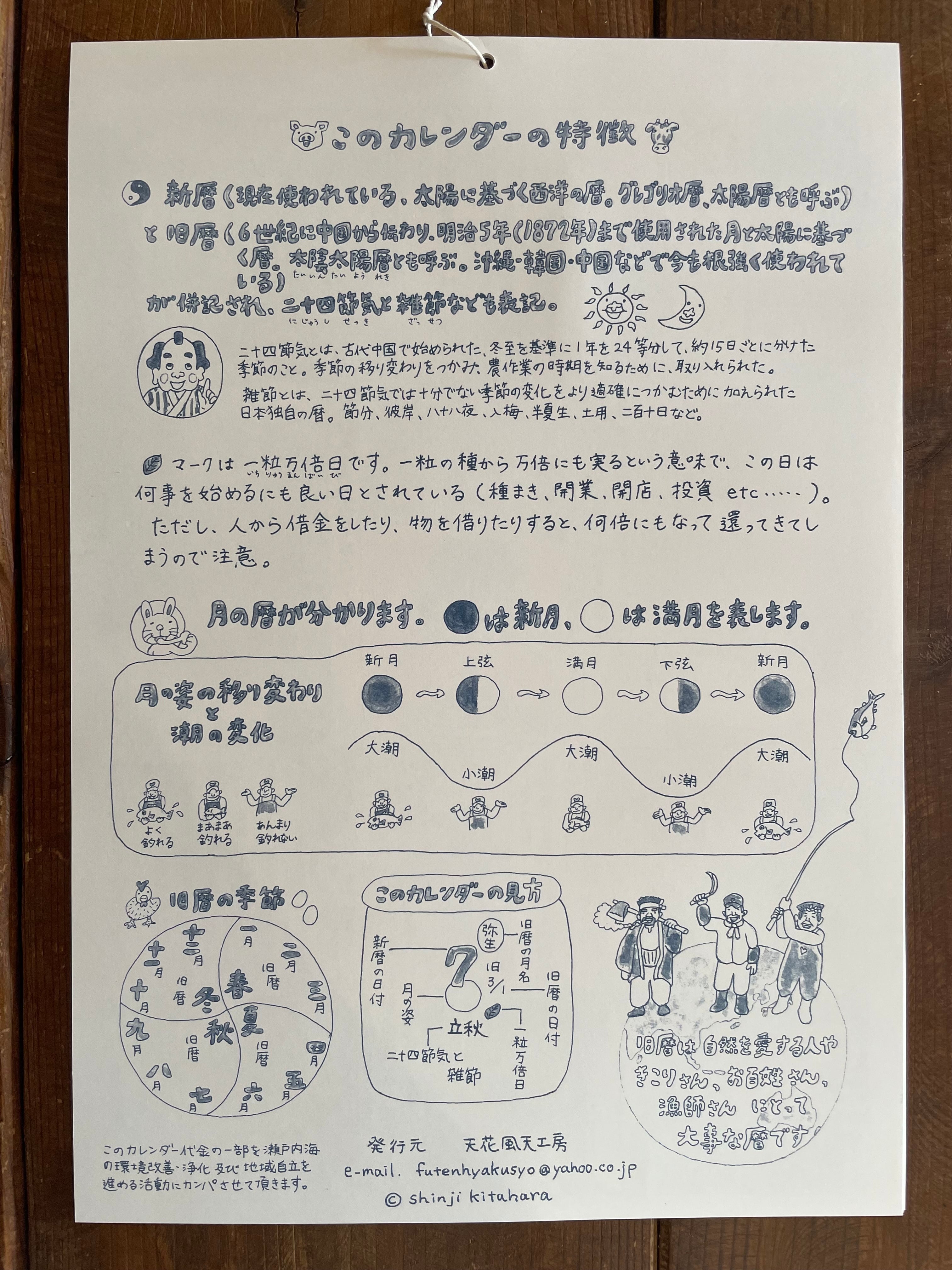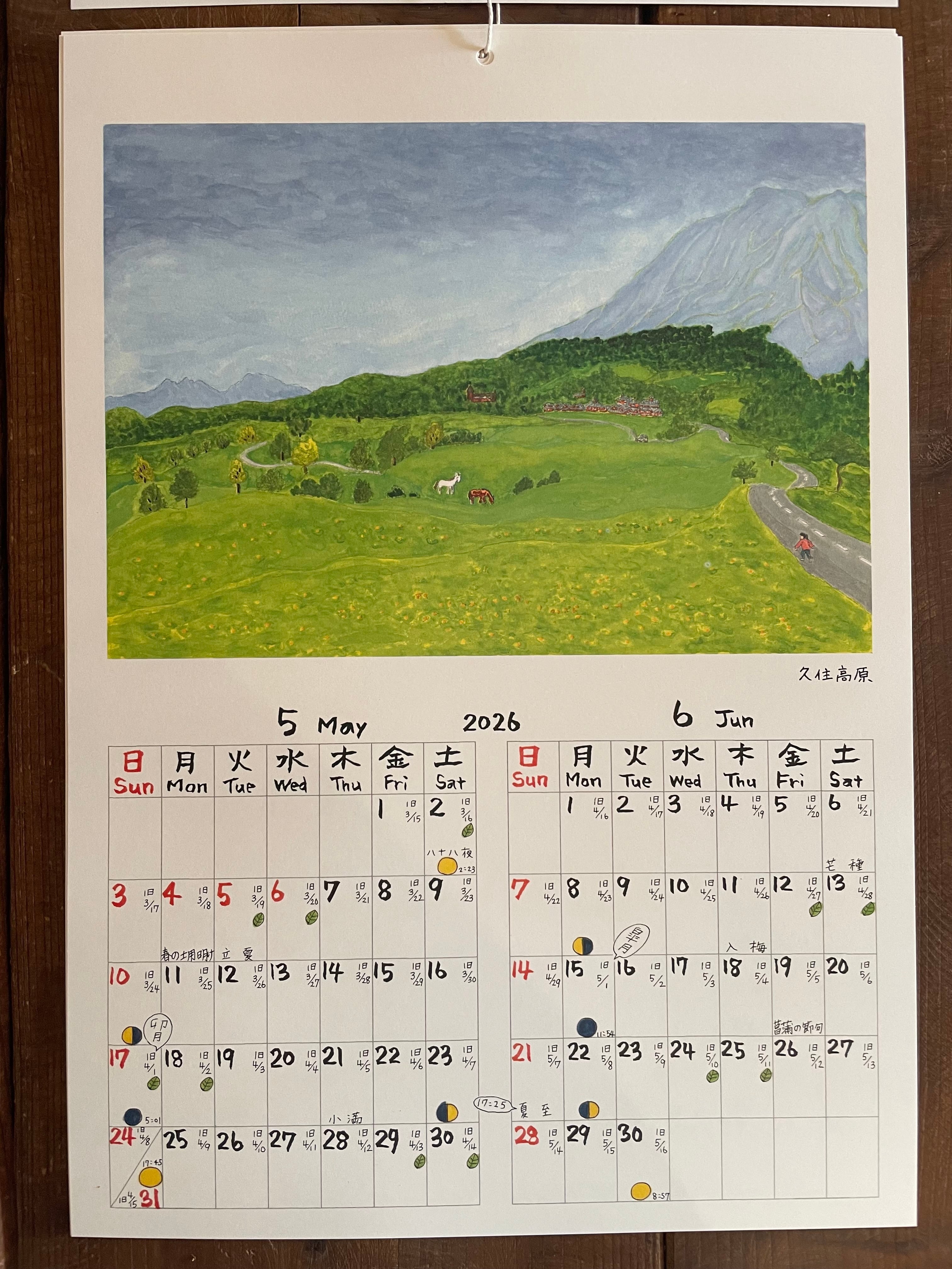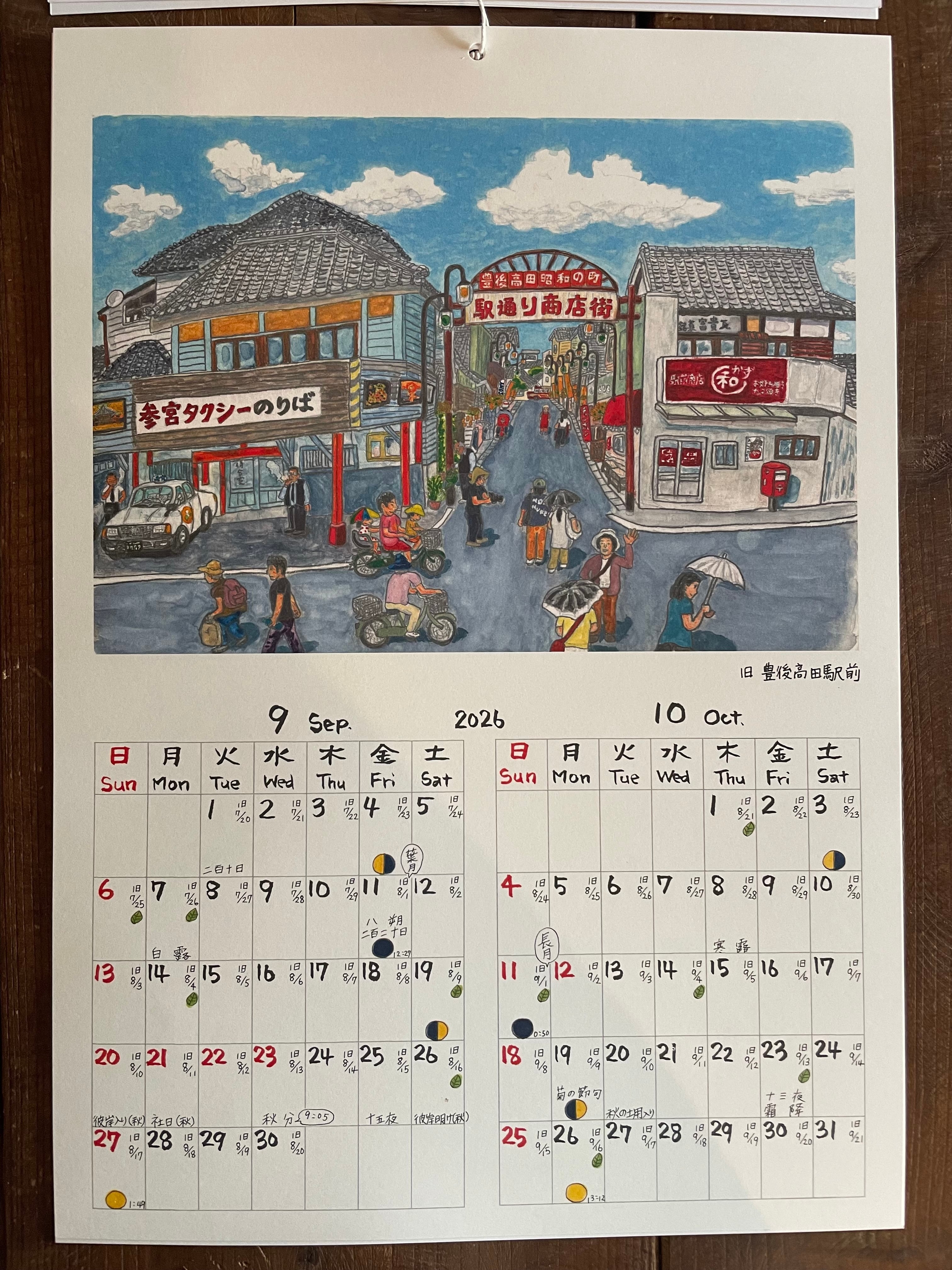 久住や豊後高田昭和の町などの大分の景色、人、動物たちと、旧暦や月の満ち欠けもわかる日付、最後のページにはオリジナルの漫画も!